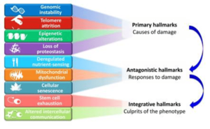 The following review1 enumerates nine tentative hallmarks that represent common denominators of ageing in different organisms, with special emphasis on mammalian ageing. These hallmarks are genomic instability, telomere attrition, epigenetic alterations, loss of proteostasis, deregulated nutrient-sensing, mitochondrial dysfunction, cellular senescence, stem cell exhaustion, and altered intercellular communication.