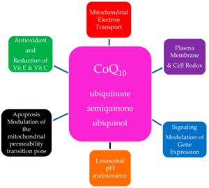 CoQ10 supplementation has been shown to have epigenetic effects in genes involved with signalling, intermediary metabolism, transport, transcription control, disease mutation, phosphorylation, and embryonal development indicating a role in the modulation of gene expression. In addition to its major function in the ETC, CoQ10 has an important anti-oxidant role in stabilizing the plasma membrane and other intracellular membranes protecting membrane phospholipids from peroxidation. Other functions include modulation of the permeability transition pore, thus playing a role in apoptosis7. CoQ10′s main functions are summarized in Figure 3.