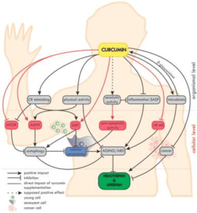 On the organismal level, curcumin mimics caloric restriction (CR) and improves the effectiveness of physical activity (which in fact mimics CR). The potential senolytic activity of curcumin is still unclear, but curcumin can reduce inflammation and SASP, which are also considered as elements of senotherapy. Moreover, curcumin maintains the diversity of the microbiome and, in turn, the microbiota secrete β-glucuronidase, an enzyme, which, by deglucuronisation increases the level of curcumin in tissues. Curcumin is able to protect against cancer and to reduce the progression of already existing tumors. On the cellular level, curcumin elevates the level/activity of some anti-ageing proteins (e.g., sirtuins, AMPK) and inhibits pro-ageing ones (e.g., NF-κB, mTOR). Autophagy, considered as an anti-ageing mechanism, is modulated by curcumin, with the effect of preventing cell senescence. Altogether, by delaying ageing and ARD, curcumin can elongate the healthspan and probably also the lifespan.