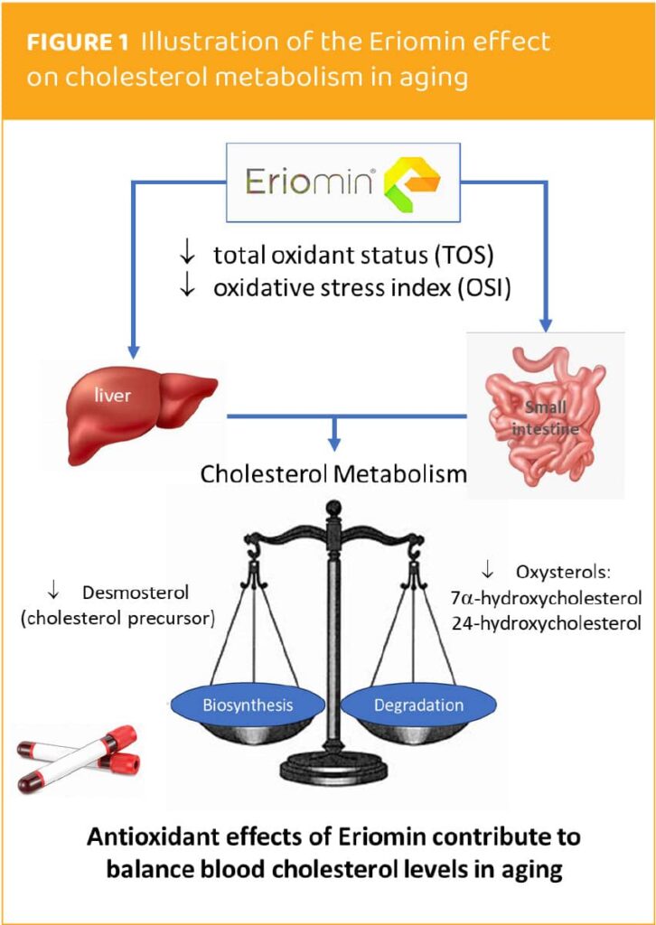 The four-week study treated aged male lab rats with Eriomin (40 mg/kg body weight) suspended in sunflower oil, and the Control group in the same age received only sunflower oil. After the four-week period, the antioxidant activity, cholesterol biosynthesis and degradation, and the absorption markers of Eriomin were measured in the blood serum, liver, jejunum, and ileum in both groups.
